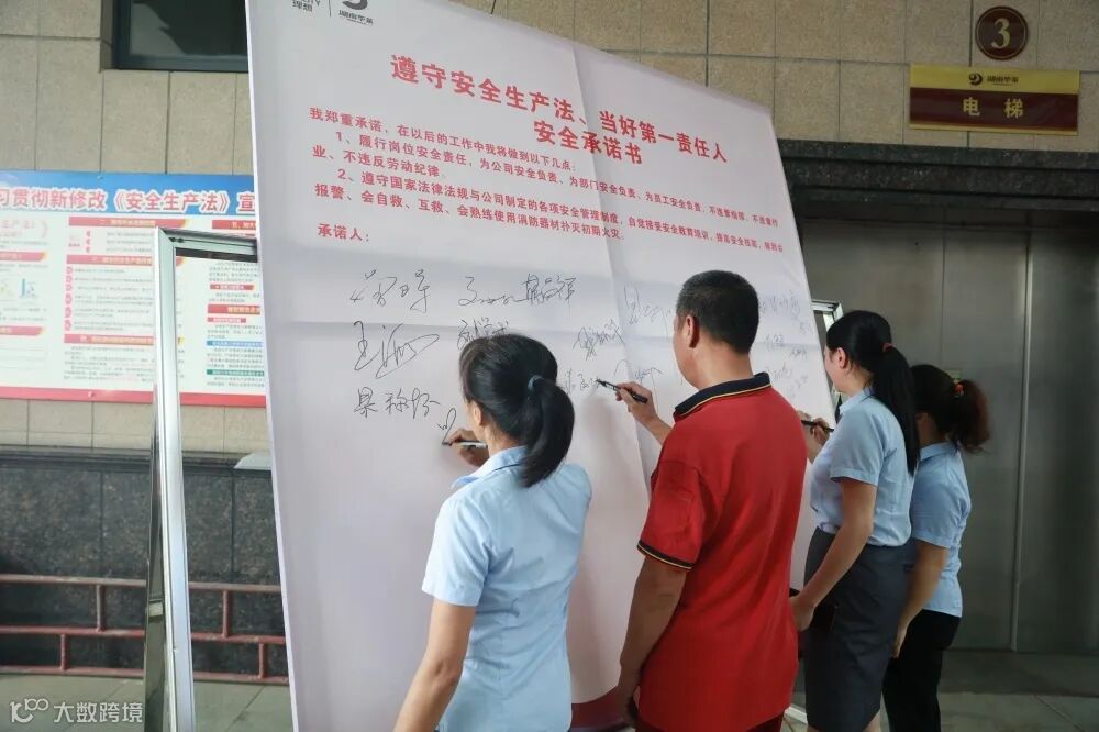 活动结尾,在我司副总经理曾卫军的带领下,生产管理中心各部分负责人及现场员工依次在写有“遵循安全生产法、当好第一责任人”安全承诺书上签名。