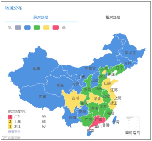 由上图可看出,此话题在全国范围内引起了广泛关注,其中广东地区的网民对此话题的关注度最高,其次是上海、浙江地区。