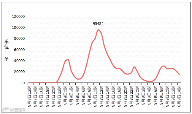 结合全网监测系统观察舆情的整体走势来看,相关舆情量在8月8日11时达到最高峰。