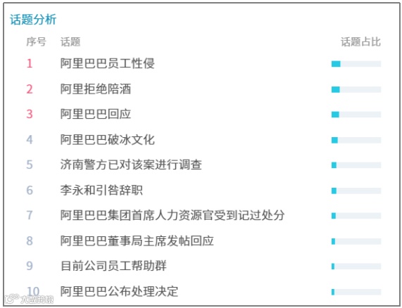 通过系统分析,由上图可看出,讨论此话题较频繁的话题主要为“阿里巴巴员工性侵”“阿里拒绝陪酒”“阿里巴巴回应”等。