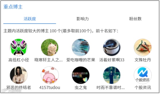 由上图可看出,通过系统对重点博主的提取分析,关注该话题影响力较大的主要有@财经网、@头条新闻、@澎湃新闻等博主,他们所发的博文都被网民转发,是推动舆论发展的主力军。