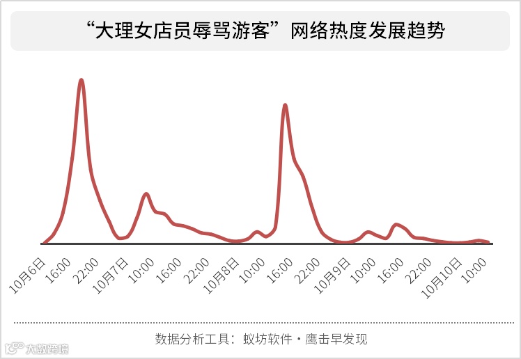 10月6日,当地官方回应大理女店员辱骂游客事件,经查情况属实,已责令涉事经营户关停整改30天。官方的回应经头条新闻、中国新闻周刊等媒体报道后迅速扩散,大理“女店员辱骂游客”伴随着事件的进展,相关舆情热度迅速攀升并于当日的18时达到峰值。