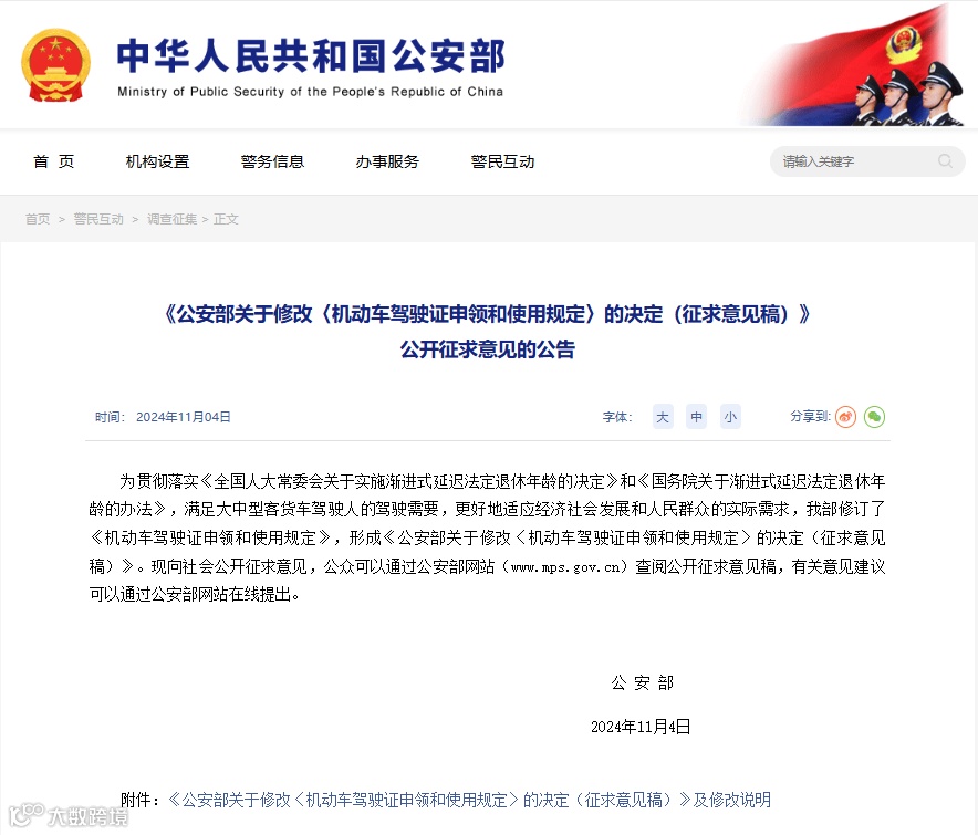 近日,公安部发布了关于修改《〈机动车驾驶证申领和使用规定〉的决定(征求意见稿)》公开征求意见的公告, 其中指出自2025年1月1日起,大中型客货车准驾车型的年龄上限由60周岁延长至63周岁。