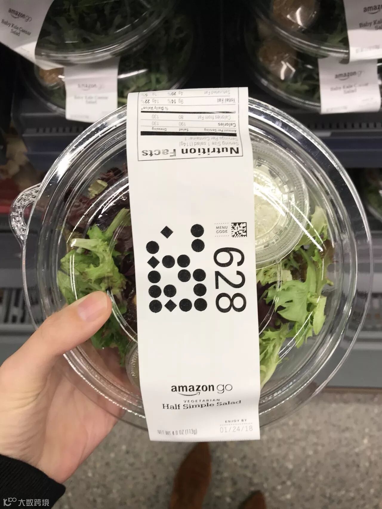 有一些不太好分辨的商品,例如美国人民最爱的健康饮食沙拉,亚马逊还在包装盒上面印了大大的类似二维码的识别图案和数字。