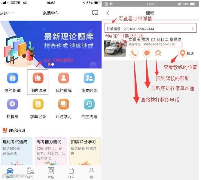 【我的教练】模块里学员预约过学时和报过名的教练都在此列表里,学员也可以通过教练的电话号码添加教练哦!预约培训学时也可以通过在我的教练列表里直接选择相应的教练进行预约!