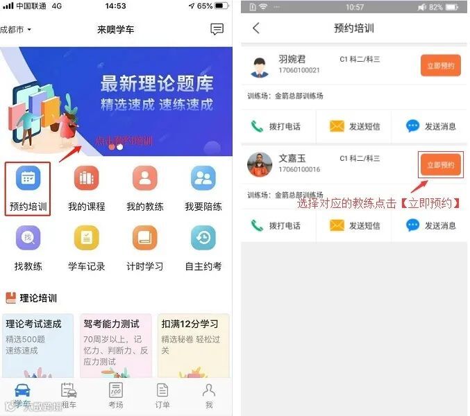 第三步 点击首页的预约培训进行教练的学时预约,如下图所示: