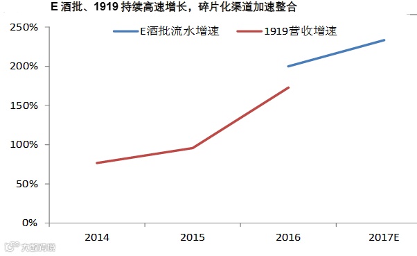 近年来,产业面正加速发生变化,E酒批、1919、酒仙网等正在迅速整合碎片化的渠道,比如E酒批宣布取得古井贡在江苏所有地级市的独家代理权,并表示将通过分享线上资源和更开放合作物流体系加速度发展,预计2017年流水达100亿。洋河董亊长王耀也拜访了1919总部,1919在门店快速扩张之后开始精耕织网,提升密度。此外,洋河蓝色经典、口子窖5年、古井贡年仹原浆等推出超过8年的老品,仍然保持双位数增长,茅、五、剑以外白酒单品生命周期延长渐成趋势,“三年喝倒一个胖子”不再是行业规律。