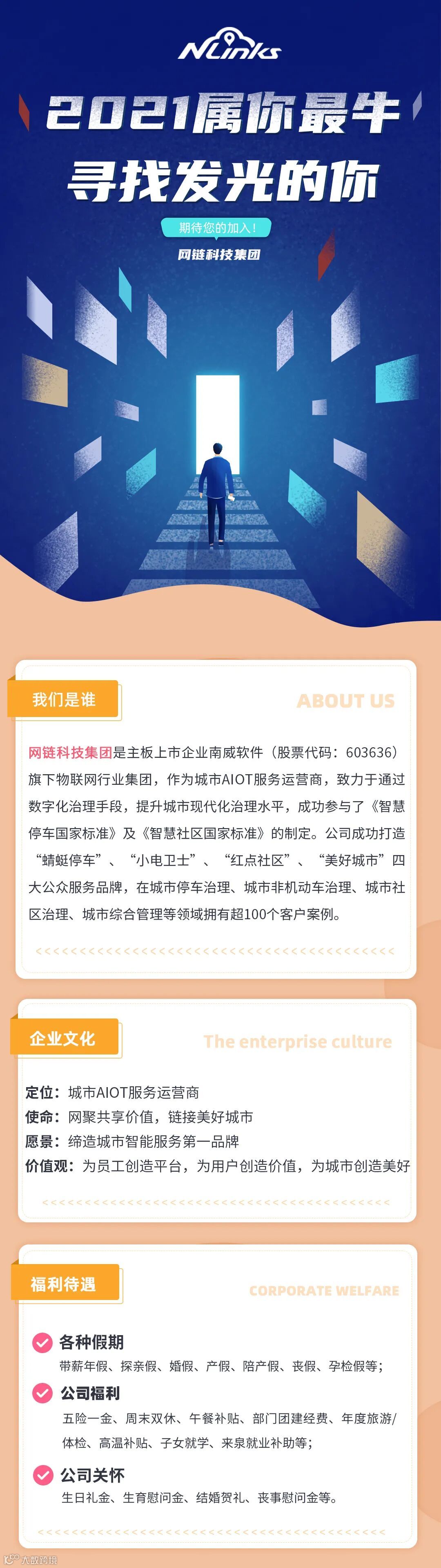 关注网链科技,即时了解企业动态,最新资讯。南威软件集团<股票代码:603636>旗下物联网行业集团——网链科技,依托南威软件在资本、技术、市场的优势资源,搭建智慧城市综合支撑平台和静态交通共享经济平台。