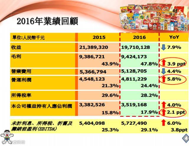 乳品及饮料类收益 92.980 亿人民币,较 2015 年衰退 13.4%。其中占乳品及饮料类收益约 90% 的“旺仔牛奶”收益 84.779 亿人民币,较 2015 年衰退 12.0%,但“旺仔牛奶”2016 年下半年收益较 2015 年下半年衰退幅度已收窄到中个位数,而 2016 年“旺仔牛奶”在现代渠道销售较 2015 年 则实现了高个位数成长。