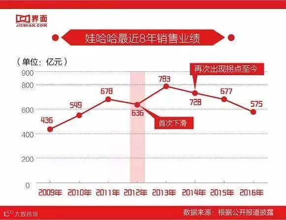 从2013年开始,娃哈哈的销售业绩已经连续4年出现下滑,2016年的销售额更是恢复到了2010年时的成绩,虽然始终稳坐在“500亿俱乐部”,但毫无疑问的是,娃哈哈正处于前所未有的困窘之中。