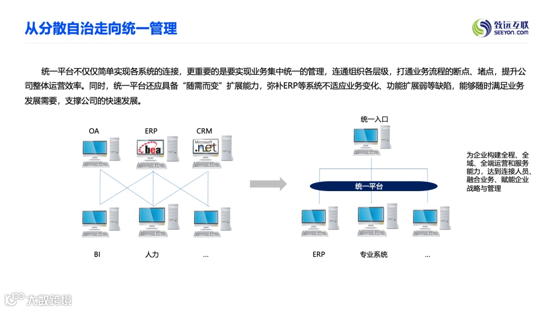 统一平台不仅仅简单实现各系统的连接,更重要的是要实现业务集中统一的管理,连通组织各层级,打通业务流程的断点、堵点,提升公司整体运营效率。