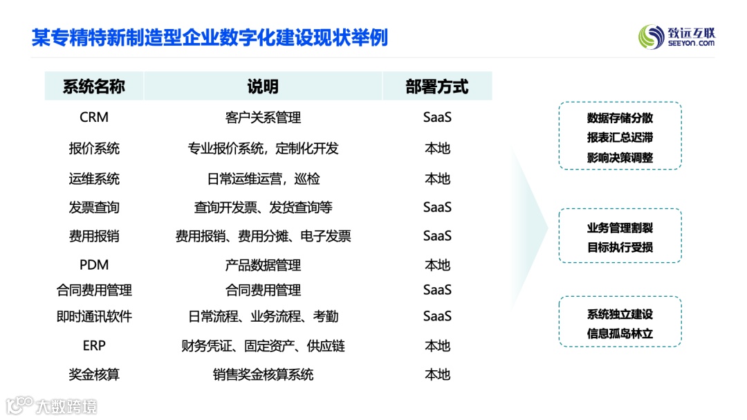 部分专精特新企业信息化建设痛点是:“救火式”建设企业信息化,业务部门会选择对自己业务开展有利的系统,力求获得局部最优解。但是容易出现以下问题: