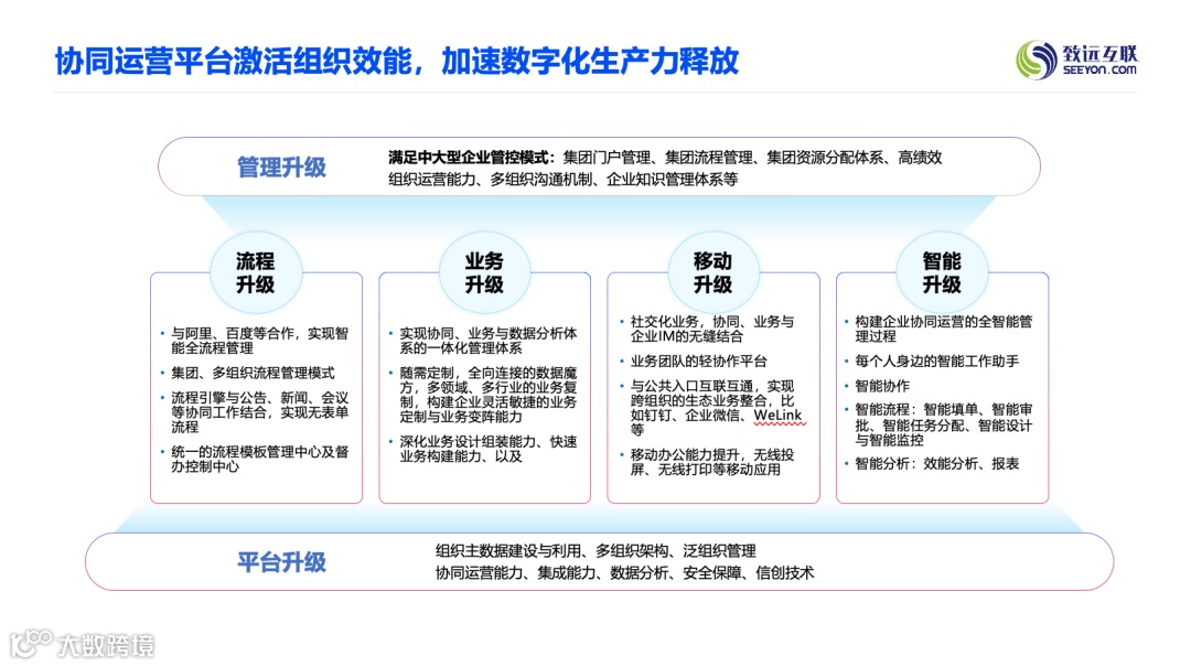 面临数字化升级的企业需求,致远互联协同运营平台,集技术、协同、业务、连接和数据中台能力为一体,提供企业集成运营管理平台和统一工作入口,为企业构建全程、全域、全端运营和服务能力,达到连接人员、融合业务、赋能企业的目的。