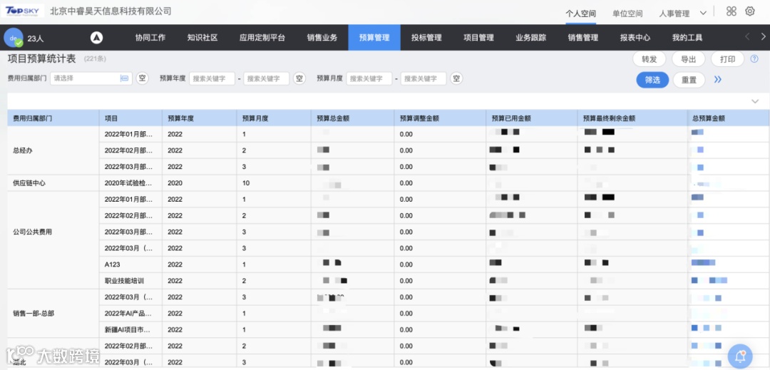 中睿昊天通过搭建预算成本管理应用,实现了各部门预算管理以及项目预算编制管理,结合项目与日常费用报销预警,在线实时提醒预算使用情况。