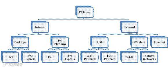 图1显示了这些总线在NI数据采集产品的PC总线层次结构中的分类,包括内部总线到热插拔的外部总线。