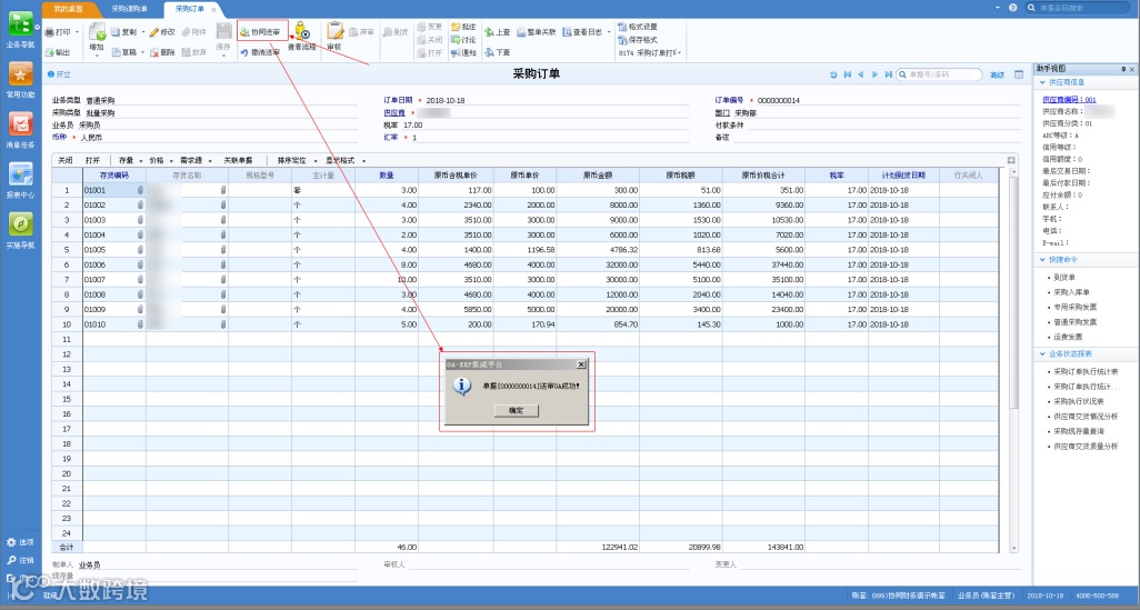 通过供应链集成,实现业务流程闭环。员工通过移动端随时查看库存信息并完成请购单填写,填写完成后,自动推送到管理者待办事项中;管理者通过PC端对业务数据进行审批并及时修正,系统依据修正内容自动留痕;已审核的采购请购单自动回写到U8采购管理系统中,采购人员参照请购单批量生成采购订单,通过“协同送审”,单据自动推送到协同平台中。通过“流程查看”,业务员可查看该单据的审批流程,实时跟踪项目进度,还可以进行催办,快速对业务进行确认,提升审批效率。在采购订单签订后,若发生订单变更,可通过“变更”功能完成数据变更,随后单据将再次送审到协同平台完成审批,采购订单变更后,在协同平台审批通过的原采购订单数据自动显示“已变更”,至此形成业务闭环。