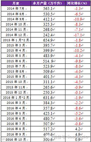 2016年12月,中国啤酒行业产量274.2万千升,同比增长15.2%;