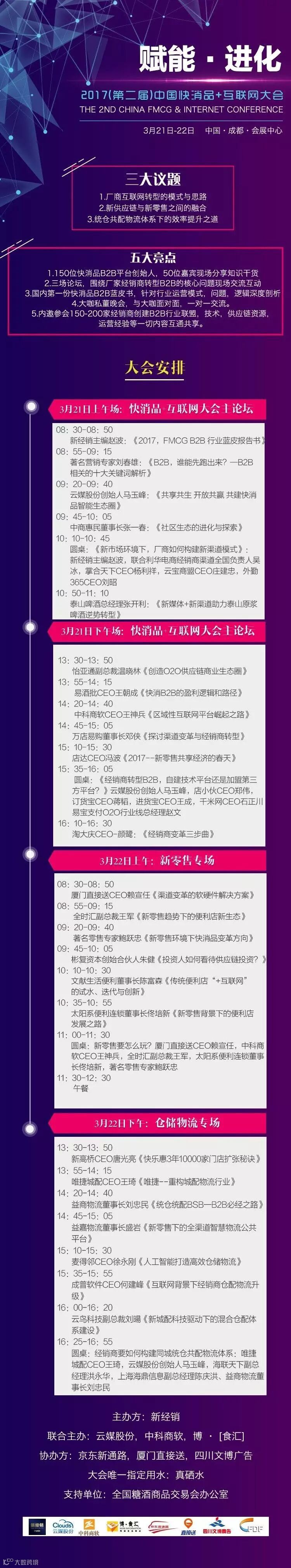 我们在今年3月份成都春糖期间21-22日举办主题为:《赋能·进化,第二届快消品+互联网大会》。