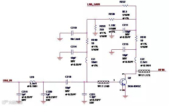 图中的LNA_GAIN是来自无线收发器(Radio Transceiver)的增益控制信号,放大器使用的晶体管就是最常用的SGA-8343,R238,R239,R240是基极的偏置电阻,C219,L20,C220组成了低通滤波器,来自切换芯片(Switch)的LNA_IN通过低通滤波器之后经由C218耦合至低噪声放大器,Q2与C221,L51,C214,R240,C210,R239,R238,C211,R241,C215,L52组成了共射极放大电路,最终输出RFIN送至收发器进行处理。