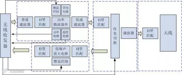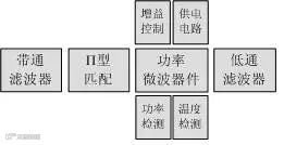 功率放大器是由带通滤波器,∏型匹配网络,功率微波器件,增益控制,供电电路,功率检测,温度检测低通滤波器这些部分组成的;低噪声放大器是由∏型匹配网络,低噪声放大电路和增益控制组成的;收发切换器是由∏型匹配网络,切换芯片,滤波器组成的;天线和连线连接器部分是由∏型匹配网络和连接器组成的。如图7-2所示。