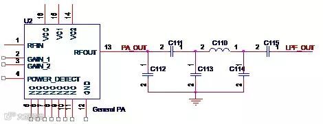 一般的低通滤波器的形式。如图3-7所示,是Ralink常用的滤波器形式。C112,C111,C113,C110和C114就组成了一个低通滤波器,来自功放芯片的信号PA_OUT经过滤波器后得到LPF_OUT这信号送至后续电路。