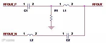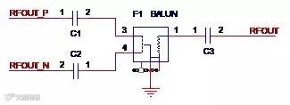 方法一,使用平衡器。原本相位相差180°的差分信号经过平衡器(Balun,俗称巴伦),就可以得到合二为一的单端射频信号。如图2-5所示,图中的F1就是一个平衡器,差分信号RFOUT_P和RFOUT_N经过F1得到单端信号RF_OUT。