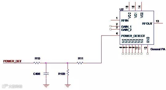 我们在图3-2中已经看到,一般的功放芯片会有POWER_DETECT这样的一个管脚,这个管脚的作用就是用于功率检测的。使用芯片内建的功率检测功能可以简化电路设计,常见的完整形式如图3-9所示。
