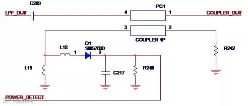 如图3-10所示,就是Atheros常用的功率检测方案。图中的PC1就是一个印制耦合器(Printed Coupler),来自功率放大器的输出信号LPF_OUT经过耦合器,就在2,3脚感应到高频交变电压,这个电压随着输出功率的增大而增大L18,L19,D1,C217,R248组成了常规的整流电路,这样,就得到了随着输出功率的变化而变化的直流电压POWER_DETECT,无线收发器就可以得到这个电压值从而做作出相应的动作。