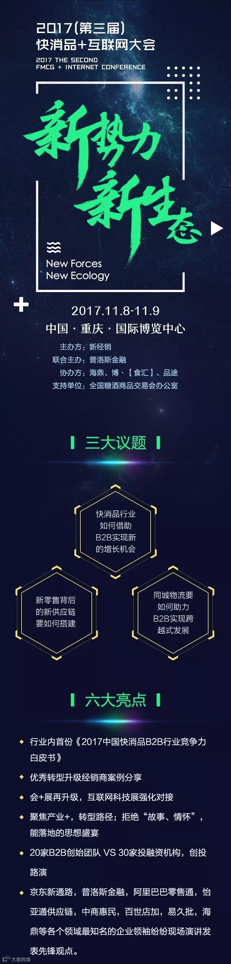第三届(CFIC)中国快消品+互联网大会将于2017年11月份在重庆举办,大会将紧密围绕“新势力,新生态”主题,邀请国内1000+经销商,500+品牌商,200+家B2B平台的创始人,100+投融资机构,共同探寻跨界融合的新篇章!