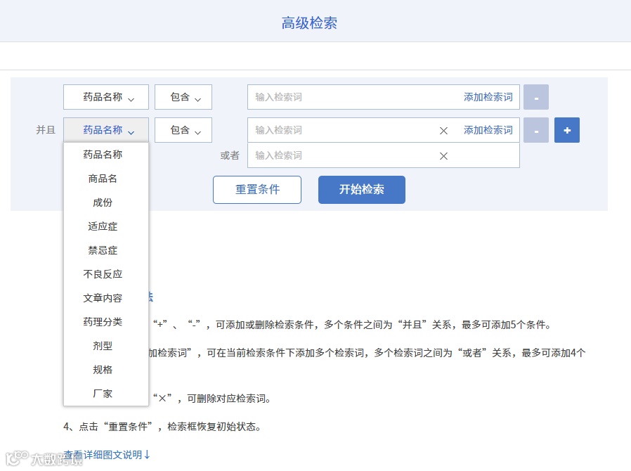 在药品说明书数据库新增了高级检索功能,支持多条件检索,更精准的找到所需结果。