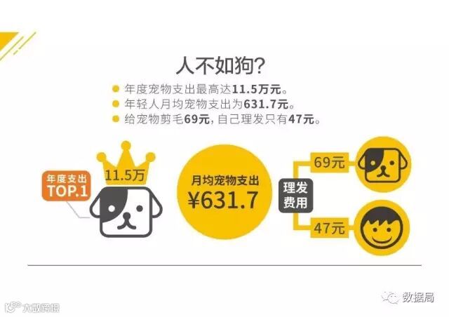 导语:2017年1月10日,易观与随手科技联合发布了《年轻人消费趋势数据报告》的趋势预测报告,报告对年轻人的收入情况、消费意愿及行为动向做了详细的研究分析,并做出了相应的预测。调查显示,年度宠物支出最高达11.5万,年轻人月均宠物支出为631.7元,给宠物剪毛平均花费69元,而自己理发只有47元,网友纷纷感叹人不如狗!