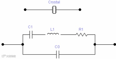 上图是一个在谐振频率附近有与晶体谐振器具有相同阻抗特性的简化电路。其中:C1为动态电容也称等效串联电容;L1为动态电感也称等效串联电感;R1为动态电阻也称等效串联电阻;C0为静态电容也称等效并联电容。