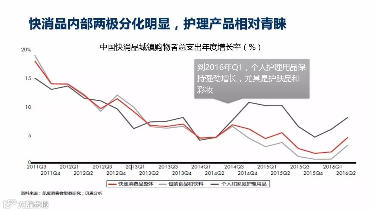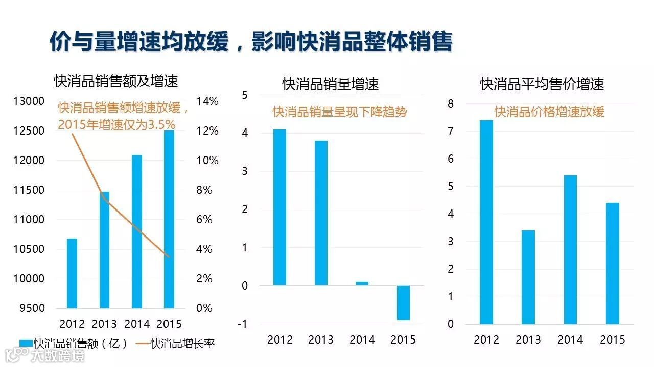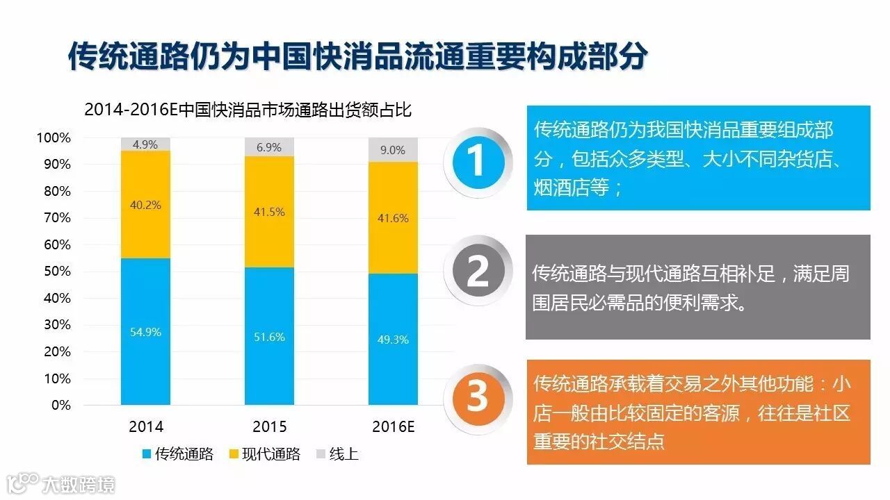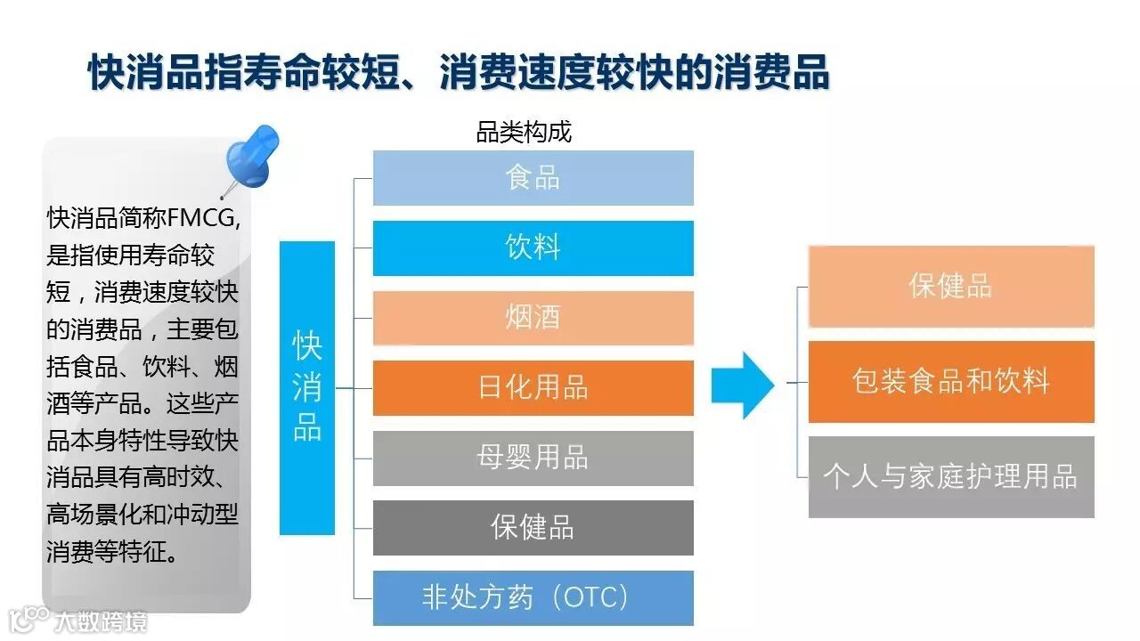 快消品是指使用寿命较短,消费速度较快的消费品,主要包括食品、饮料、烟酒等产品。快消品消费具有高时效性、高场景化、低客单价特征。目前快消品市场规模整体增速约为3%,每户家庭快消品支出占比明显下降。从地域看,快消品西部、东部销售额增速领先,北区销售额发展缓慢;从渠道看,快消品线上销售额占比仅为4.3%,处于低位,因而线下渠道仍为快消品主流。