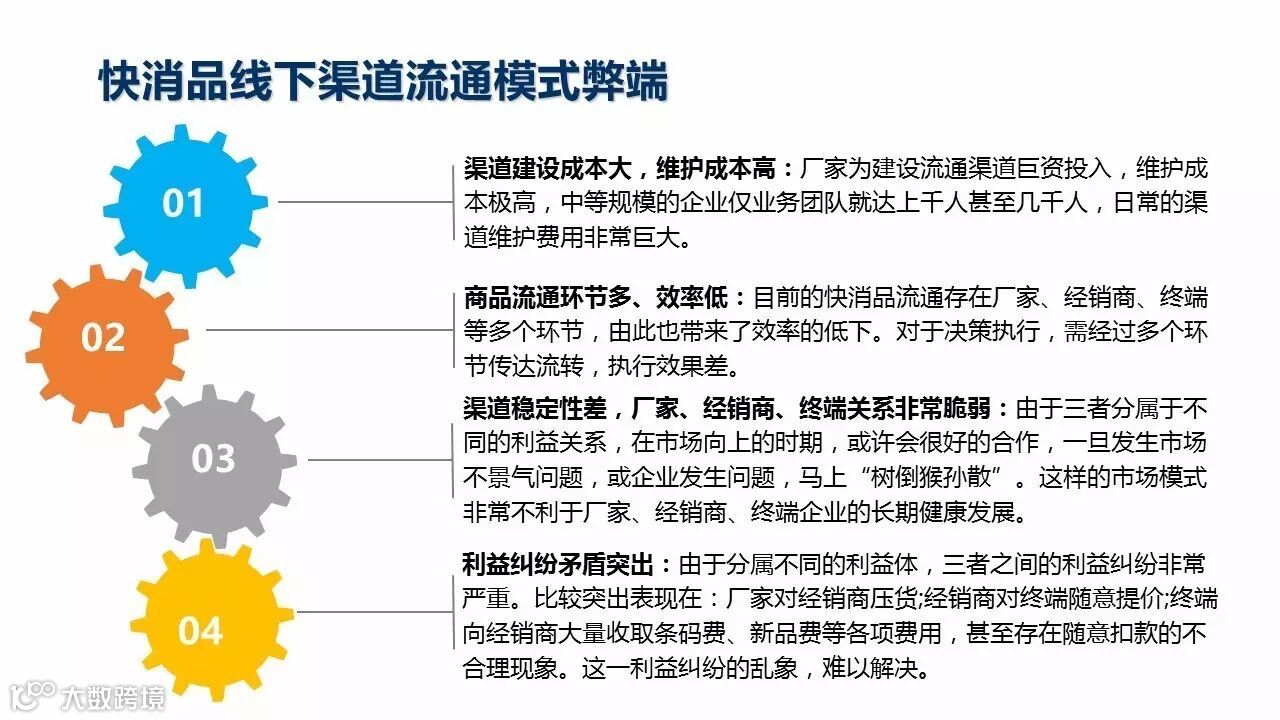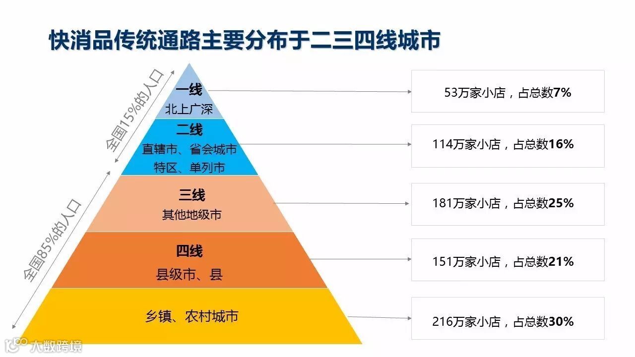 快消品线下市场多渠道竞争激烈,发展已较为成熟。传统通路仍为快消品流通重要构成部分,2015年占比高达56.6%。目前快消品传统通路主要分布在二三四线城市,作为传统通路重要组成部分城市小店在二三四线城市数量占比高达93%,有超过660万家小店,2015年这些城市小店销售额为5.363亿,占比超过30%,城市小店作为快消品重要渠道,价值不容小觑。对于传统通路而言,由于传统经销模式供应链层级过多,渠道利润被严重消耗。同时存在渠道建设成本大、商品流通环节效率低、渠道稳定性差和利益纠纷矛盾突出等严重问题。而在“互联网+“的浪潮下,快消品B2B商业模式为解决传统通路快消品流通效率低下提供新的思路。