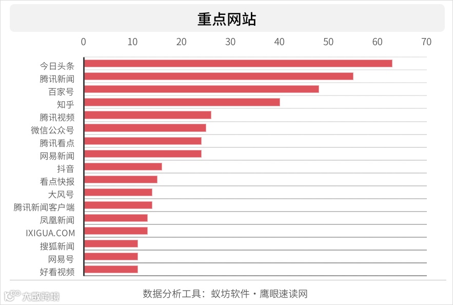 从传播这一话题的重点网站分析来看,主要集中在新闻媒体、自媒体、视频网站等几大类。新闻媒体主要就事件本身进行报道;在互联网快速发展的今天,受众群体的关注点从原先的传统媒体到现在的自媒体发生了一定转移,原因在于自媒体迭代速度较快,零界限发展,并且很大程度上能产生一定的收益等特点,更进一步促进了越来越多自媒体的加入和不断发展。视频平台,尤其是短视频平台的异军突起,让人们获取新信息的方式从平面的文字转向视频动画,方式更为便捷。