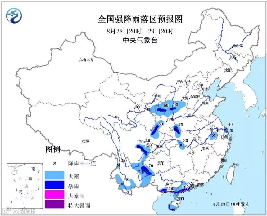 预计8月28日20时至29日20时,广东西部、广西南部、海南岛西部和南部、云南南部和东部、贵州西南部、四川盆地南部和西北部等地的部分地区有大雨或暴雨,其中广东西部沿海、广西南部沿海、四川盆地西南部局地有大暴雨(100~200毫米),上述部分地区有短时强降水,最大小时雨强50~80毫米。此外,宁夏南部、甘肃东北部、陕西北部和西南部、河南西南部、湖北西北部及苏皖南部等地的部分地区有大雨,局地有暴雨。
