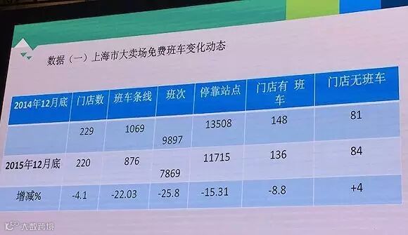 上海连锁经营研究所所长顾国建提供的一份调查报告也印证了这一点,2014年12月底-2015年12月底,其调查了229家大卖场班车之后发现,一年之内班车条线减少了22%,班次减少25.8%,停靠站点减少15.3%。从其调查的近四年之间大卖场班车所接送的客流来看,来客总人数减少了26.3%。