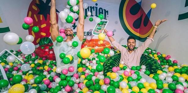为了宣传新口味,巴黎水在纽约还开了一家快闪店。在快闪店里不仅可以品尝到新口味的饮品,还可以感受一系列互动营销活动。一个泡沫球坑,一个巴黎水鸡尾酒酒吧和一个互动艺术墙。听起来都很适合拍照发朋友圈呢!