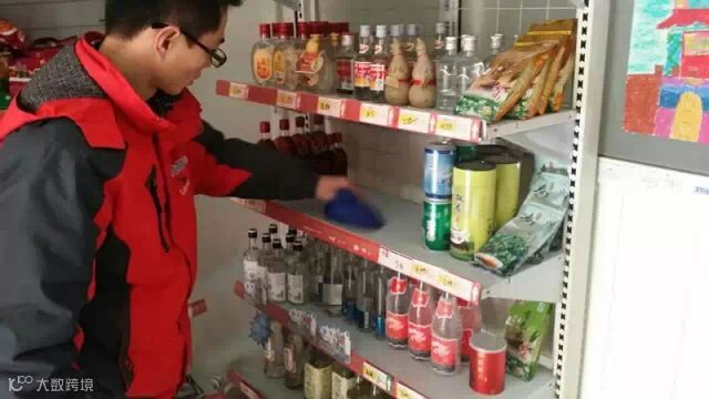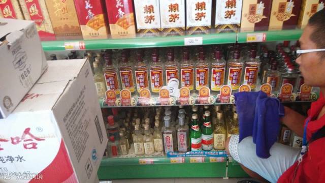 2,将货架上的灰尘和酒瓶上的灰尘擦拭干净。