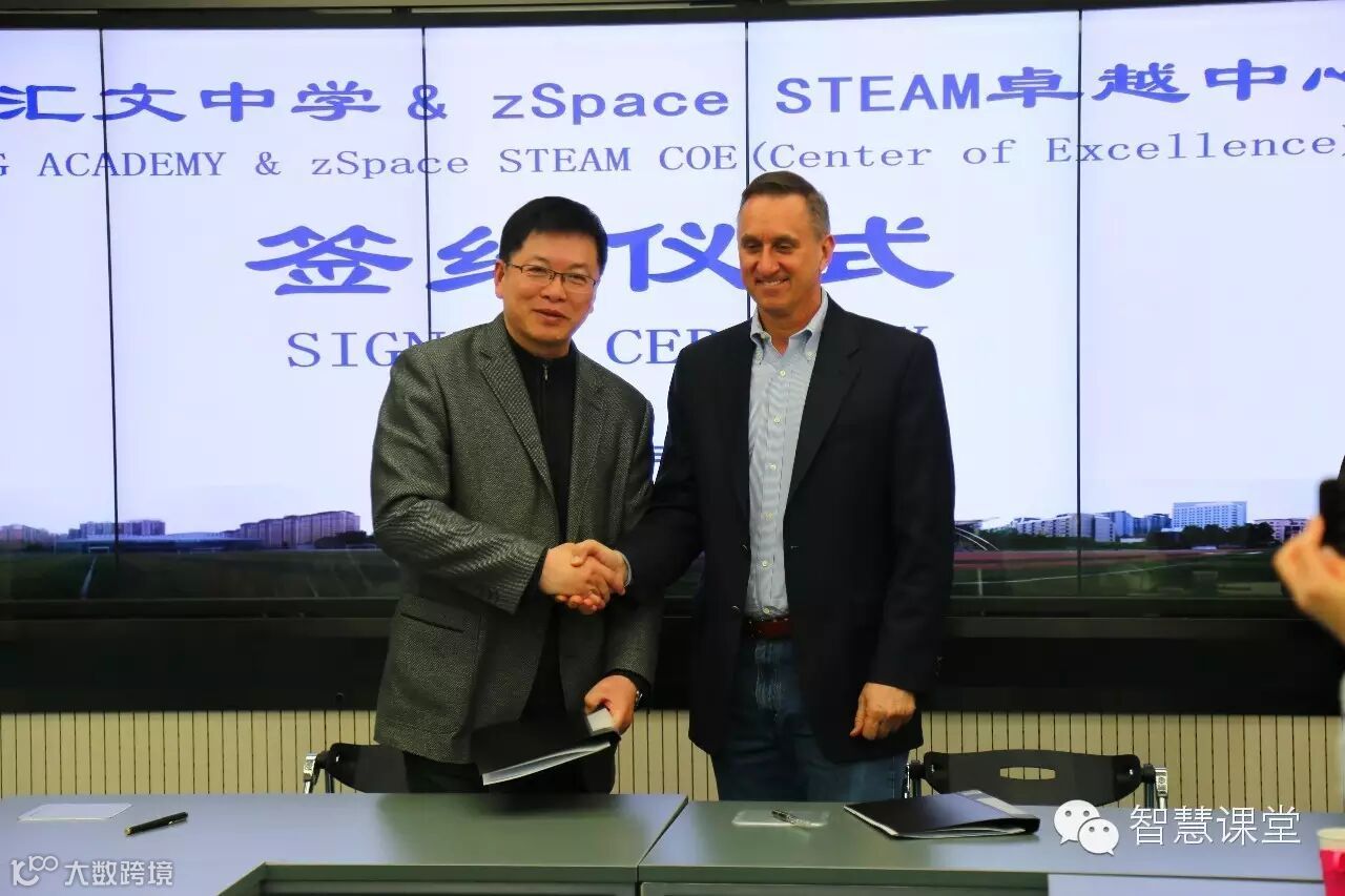 北京汇文中学与北京博雅智学软件有限公司站在教育面向世界的高度,历经了前期多次考察、探讨、碰撞,2016年2月29日,美国zSpace公司CEOMr Pual Kellenberger来访,奠定三方合作的基础,达成了创立北京汇文中学zSpace COE(卓越中心)、3D虚拟现实探究实验室的共识,并举办了zSpace COE(卓越中心)签约仪式。今天,随着红色幕布的正式揭开,博雅智学与北京汇文中学联合成立的第一家3D虚拟现实探究实验室、美国zSpace公司在中国设立的第一所zSpace COE卓越中心(中学)正式落成,VR技术推开了k12教育领域的大门。