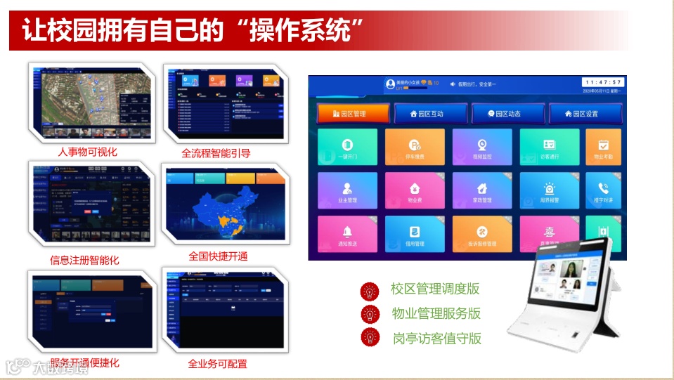 面向校区管理者、物业管理者,智慧营盘可以提供可视化、便捷化、智能化的操作能力;面向全国合作伙伴,提供全流程智能引导、快捷开通、全业务配置的SAAS化服务能力;为不同用户使用场景,发布3款智慧营盘一体机:校区管理调度版、物业管理服务版、岗亭访客值守版。