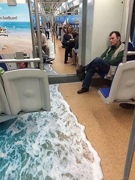 其实,国外这种创意已经不新奇了。下面是雅典地铁里的广告创意。很有沙滩浪漫清新的感觉。