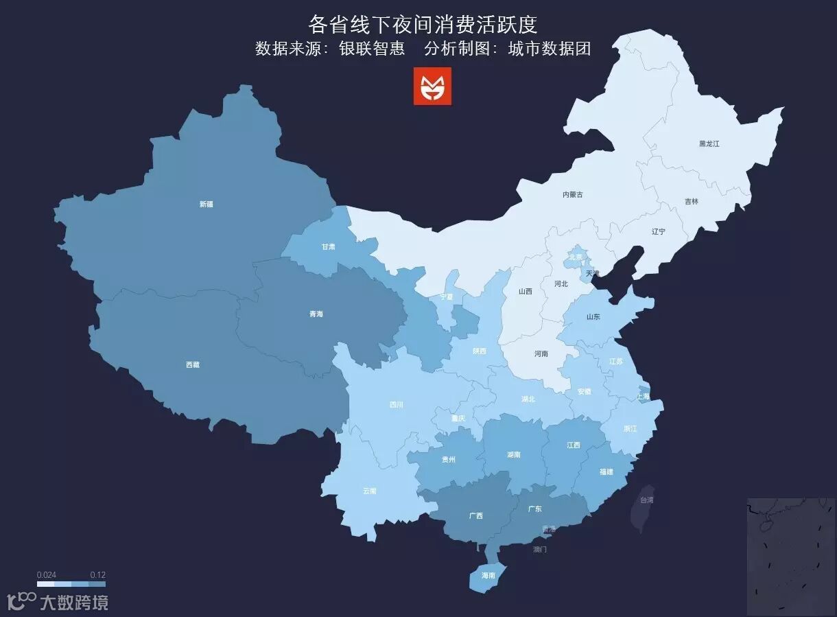 图中,颜色越深的地区夜间消费越活跃。可以看到,华南两广(广东、广西)和西北三省(新疆、西藏、青海)的夜间消费活跃程度最高。