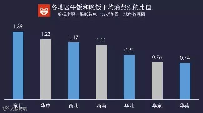 可以看到,东北、华中、西北、西南的午饭平均消费高于晚饭,华北、华东、华南则是晚饭高于午饭——总体而言,北方城市比南方城市在吃午饭上消费更高。