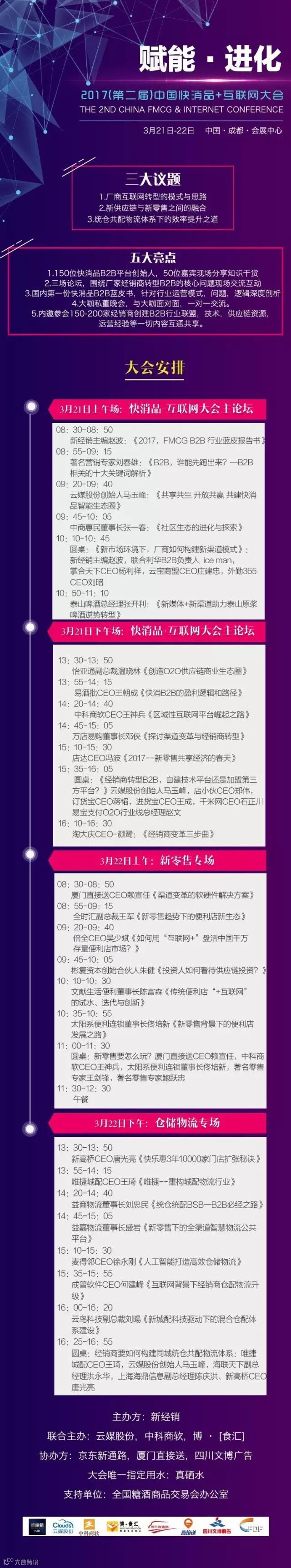 我们在今年3月份成都春糖期间21-22日举办主题为:《赋能·进化,第二届快消品+互联网大会》。