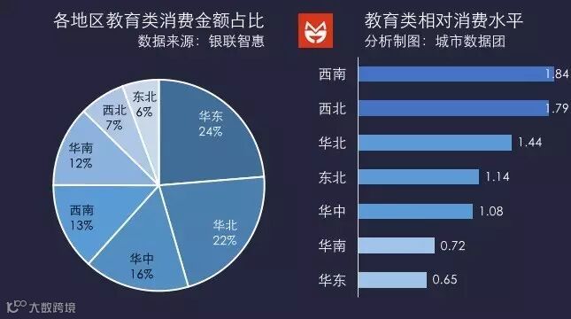 尽管从教育类的消费总额及其占比来看,份额最大的地区仍然落在较为发达的华东、华北。但从相对消费水平来看,相对贫穷落后地区的教育类支出占总支出的比例更高。