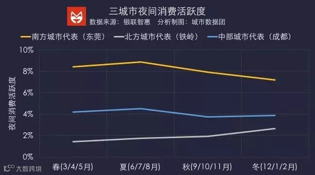 北方城市(灰线,以长春、铁岭、沈阳为代表)虽然夜间消费活跃度仅有2%,但从夏天到冬天,天气越冷,夜间消费越是生猛。关于这个现象,一位东北同事给出了解释: