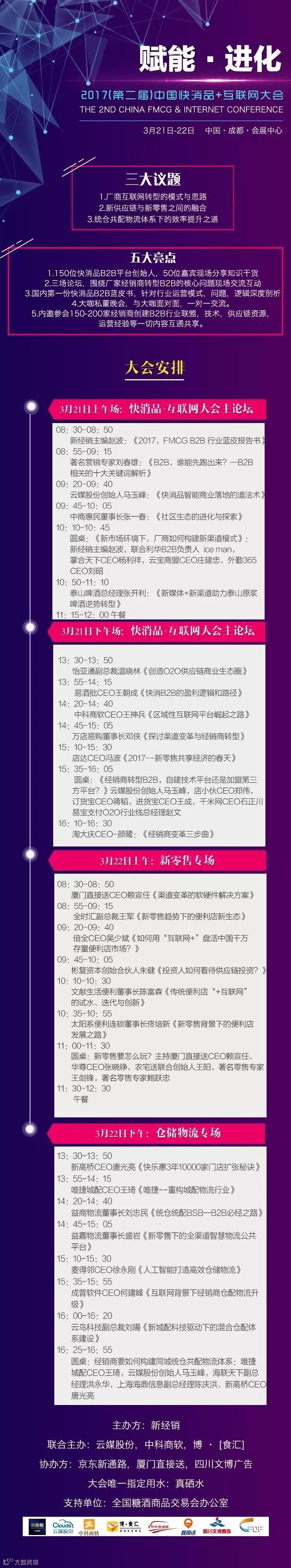 我们在今年3月份成都春糖期间21-22日举办主题为:《赋能·进化,第二届快消品+互联网大会》。