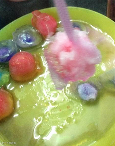 取少量油,选取三种颜色(如红、黄、蓝)滴加1-2滴。搅拌,油和色素不会融合,而是呈小颗粒装。