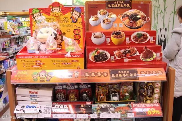 在这个货架上,没有一件商品会平白无故出现。以全家便利店为例,目前第一层是专门为春节推出的活动商品,第二层是话题性商品,比如《星球大战》、《功夫熊猫》的电影周边。再往下数,“买一送一”、“两件八折”……每一件商品前都打上了促销标签。